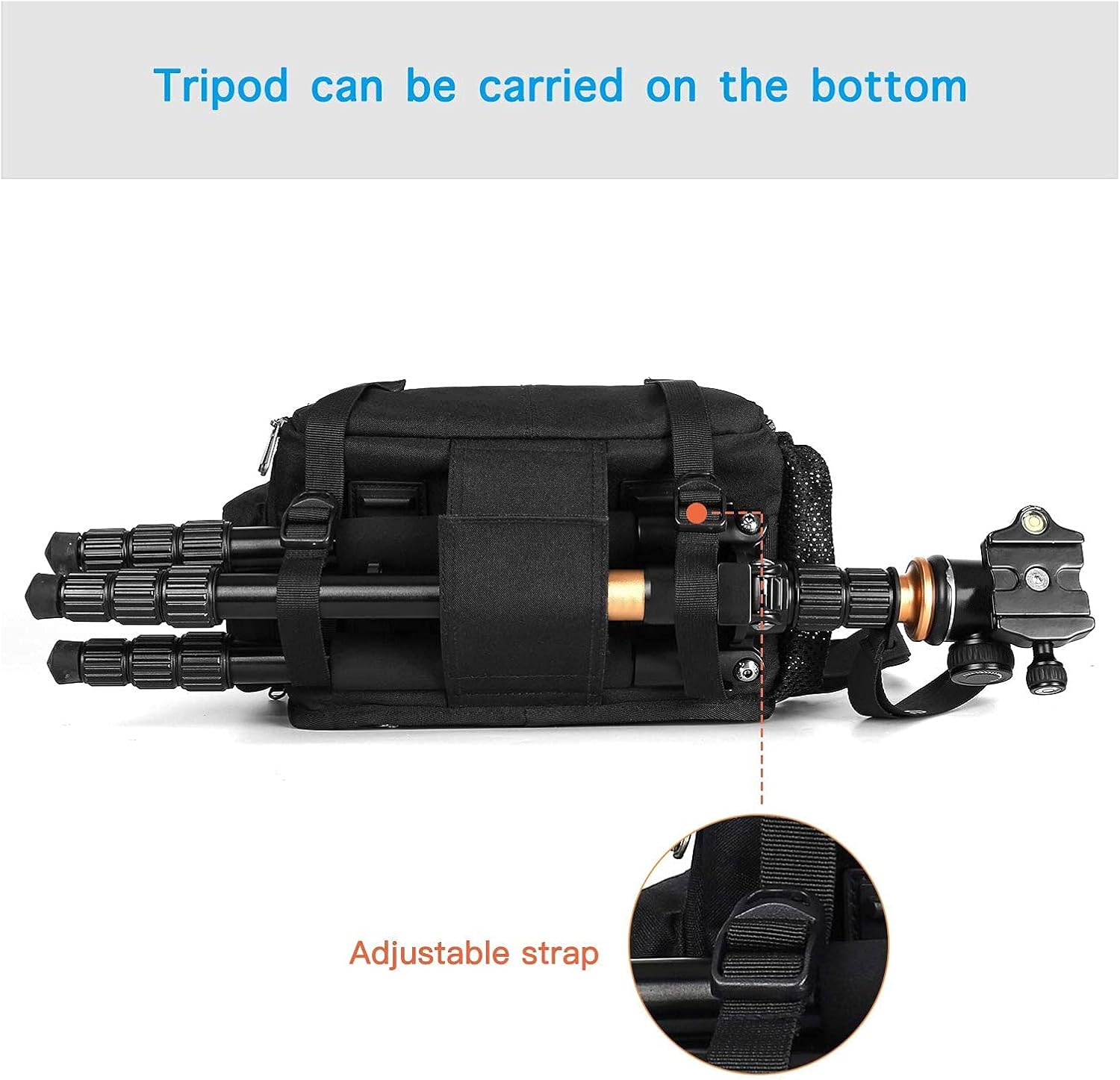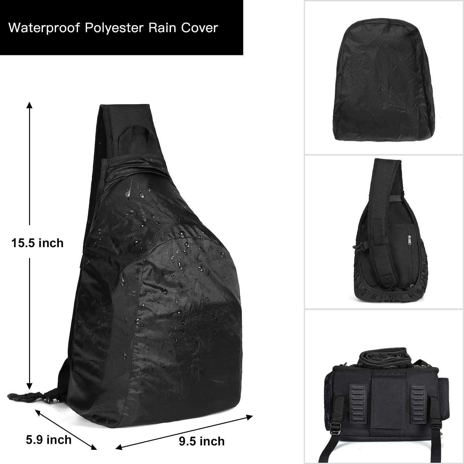 - Tripod holder is featured on one mesh net pocekt. Other smaller items can be kept in another side small pouch bag with zipper. 2 parts on the back, 1 hidden anti-theft zippered pocket on the back for your precious items, 1 vertical zipper bag can store the rain cover which comes with this camera sling bag.