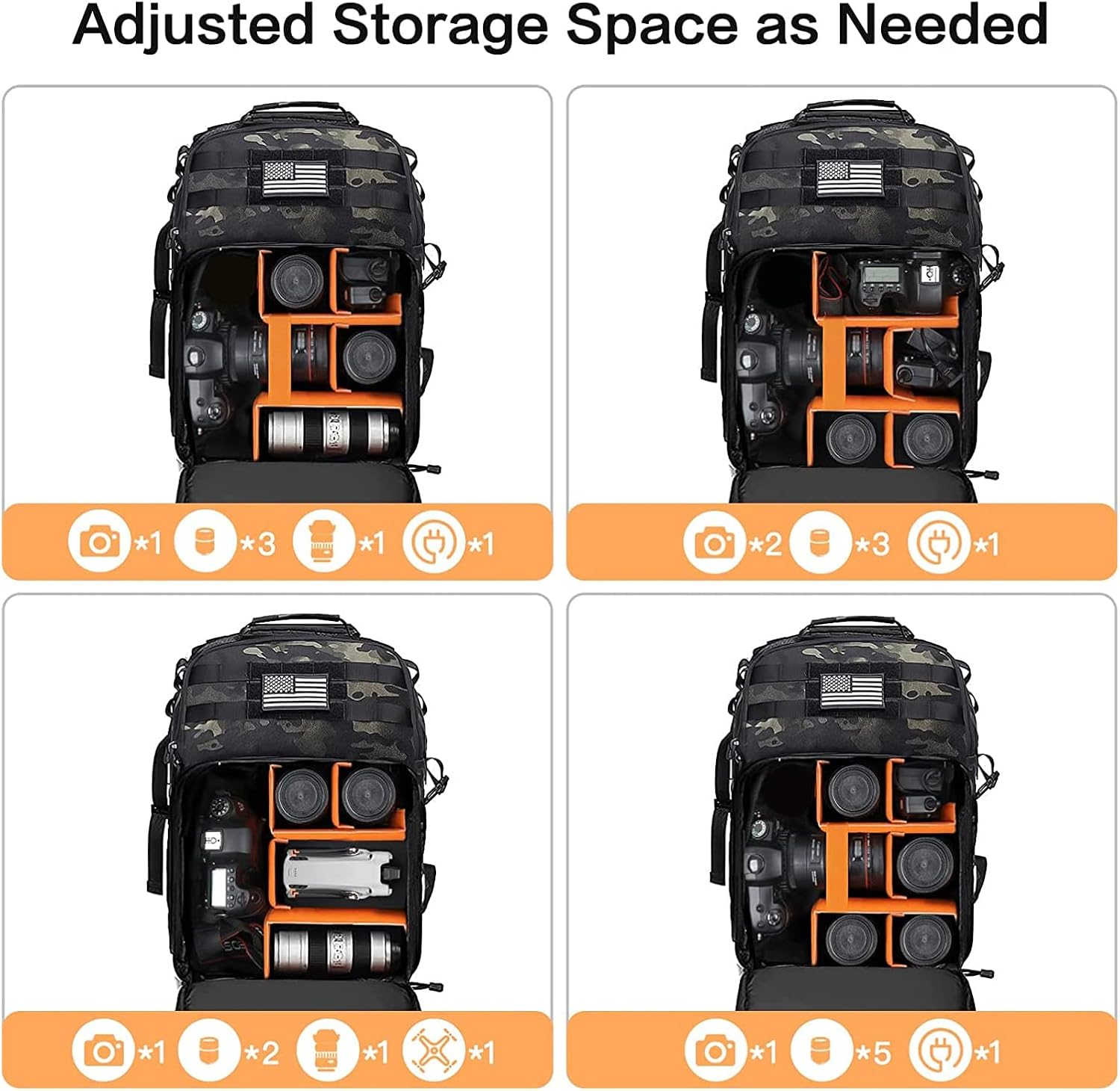 - This night camouflage tactical camera backpack daypack is made of durable polyester material. A removable USA flag patch in front and webbing throughout whole bag can attach additional pouch or outdoor gear. Inner foam padded layer can provide good buffer and protection to your internal stuff against scratches, impact, shock and drops. Reinforcement edge & bottom with side load compression system, perfectly used in wild environment.