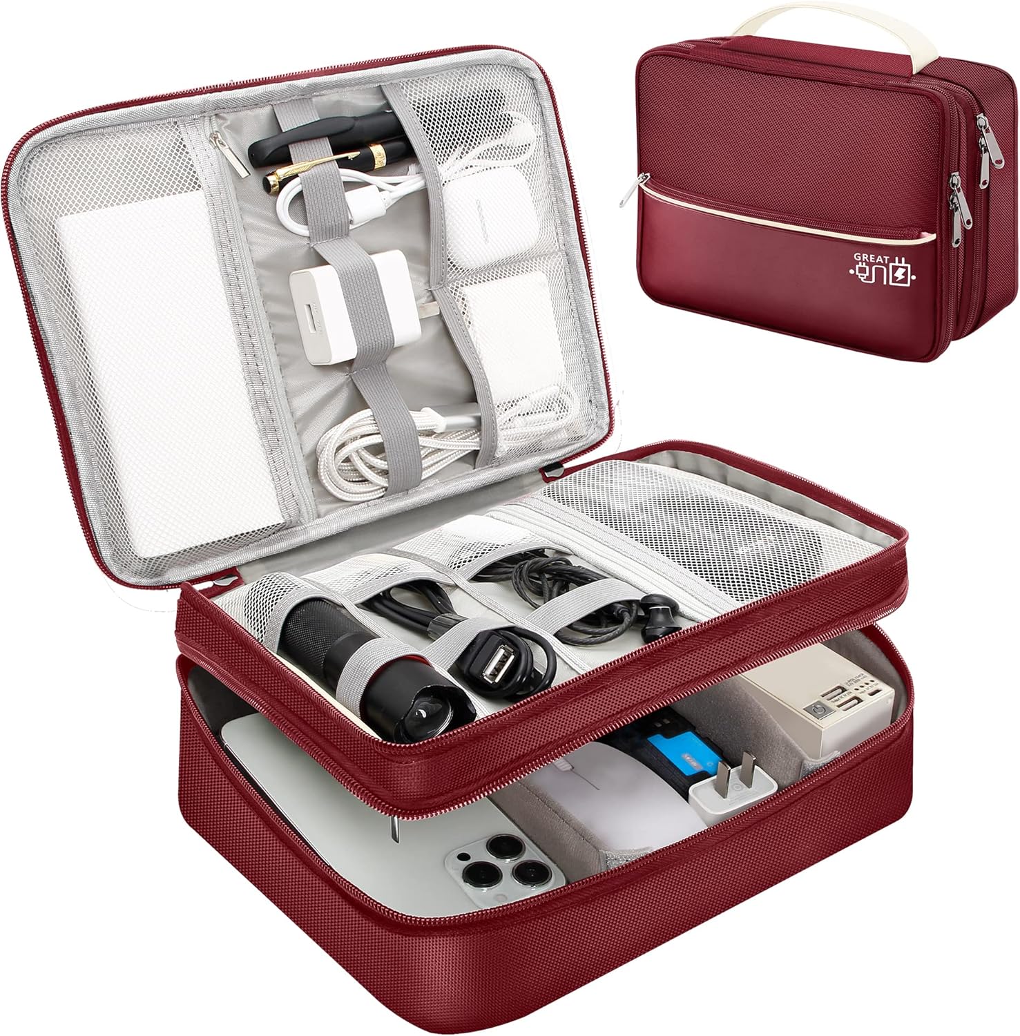 • DOUBLE LAYERS: The electronics bag is designed with 2 Layers interior compartment, the upper compartment can be used to organize Cable, Charger, Cellphone, Flash Drive, Earbuds, the lower compartment can store Adapter, Hard Drive, Power Bank, Tablet Computer. The front pocket provide a easier way to store your Cable, Cellphone or Power Bank.