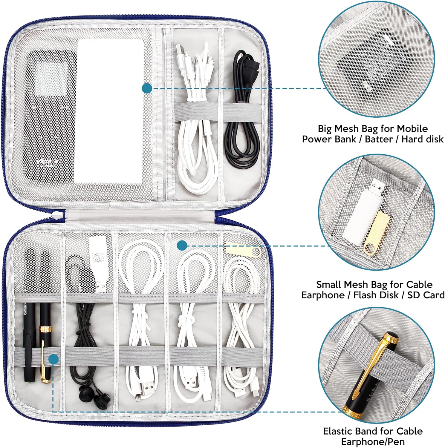 - PRACTICAL STRUCTURE: The charger case provides 1 inner mesh pocket for your portable hard drive, 5 mesh pockets with elastic loops for USB cables, earphones, etc, 7 elastic loops for slender cables, earphones or pens to prevent cables from getting enttangled. The front leather pocket is convenient for you to take your mobile phone, power bank.