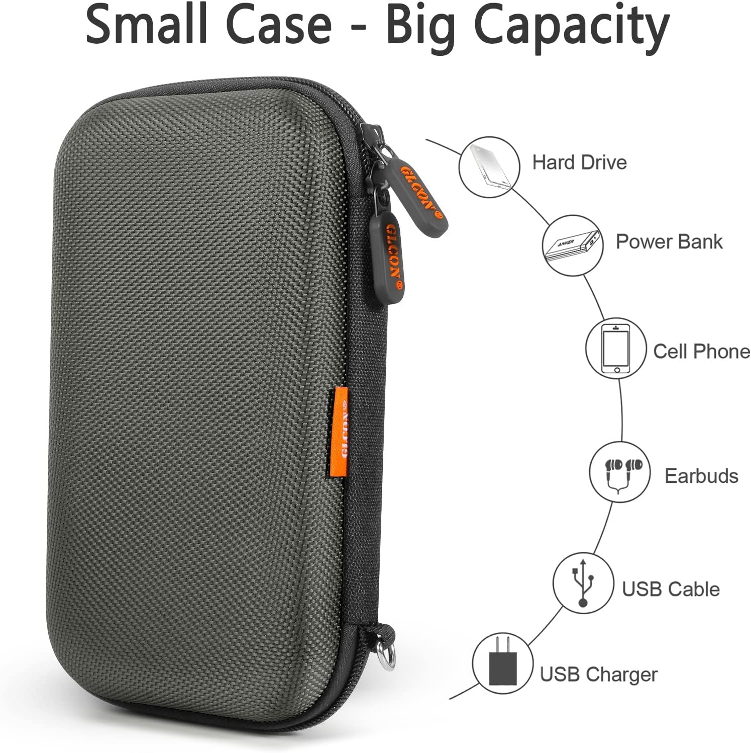 - Universal Hard Storage Pouch - This electronic case is widely used for storing your external hard drive, power bank, cords, cables, battery, cellphone, charger, adapter, earbuds, cash, credit card and other small accessories