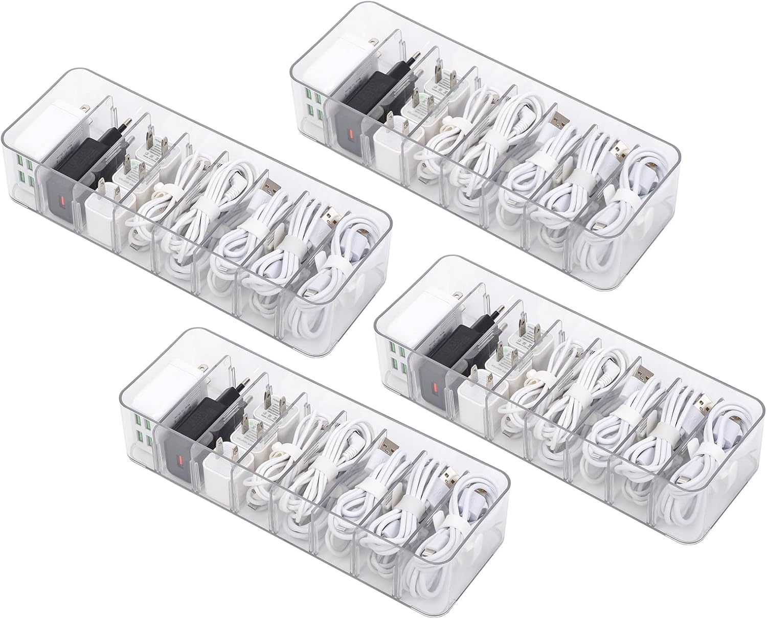 - 【REMOVABLE DIVIDERS & 40 WIRE TIES】: 4 pack of Clear cable management boxes will come with 40 wire ties, it can store more than 10pcs of cables and wires which is perfect for meeting your different needs. Adjustable and detachable compartments design and transparent design help you organize the space well and clearly, and it’s no longer a messy tangle of wires and cables on your desk.