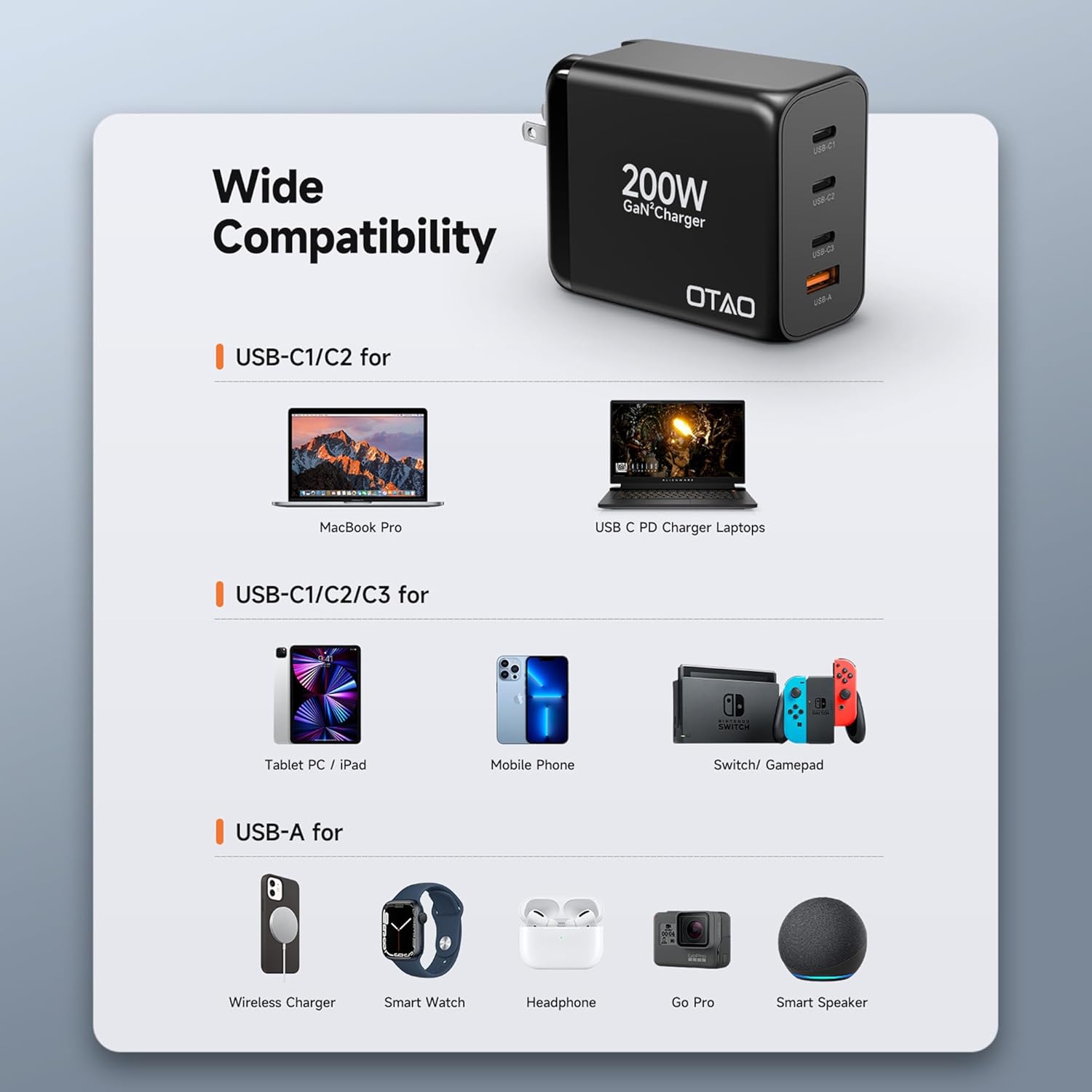 - Powerful 200W Output: This GaN charger delivers a total of 200W, providing rapid and efficient charging for all your devices. And supporting 100W+100W fast charging power for two laptops at the same time, fully charged in about 1 hour. All the devices includes laptop, tablet, smartphone, and other gadgets can enjoy quick and reliable power.