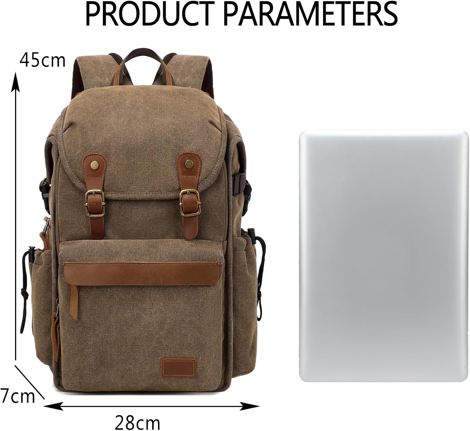 - The material of the big camera backpack is decorated with wash canvas and crazy horse leather, which is fashionable and durable. The color of the camera bag is gray black and coffee color. Its appearance size is 28x17x45 (cm) and its weight is 1.58 kg.