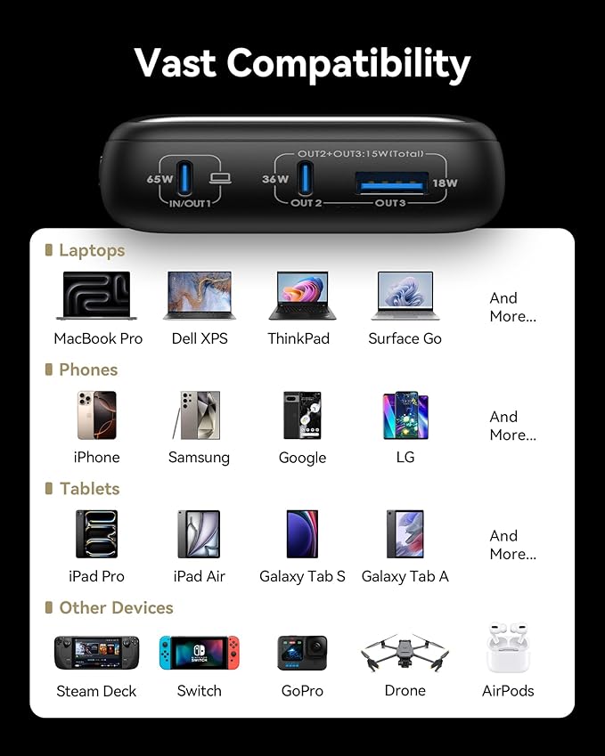 - Power Ready iPhone & MacBook in 25Mins: A must-have for multi-device users, this power bank provides up to 65W high-speed charging for two devices simultaneously. In just 25 minutes, it can charge your MacBook Air 13" to 41% and iPhone 15 to 56%. It also supports Samsung Super Fast Charging 2.0.
