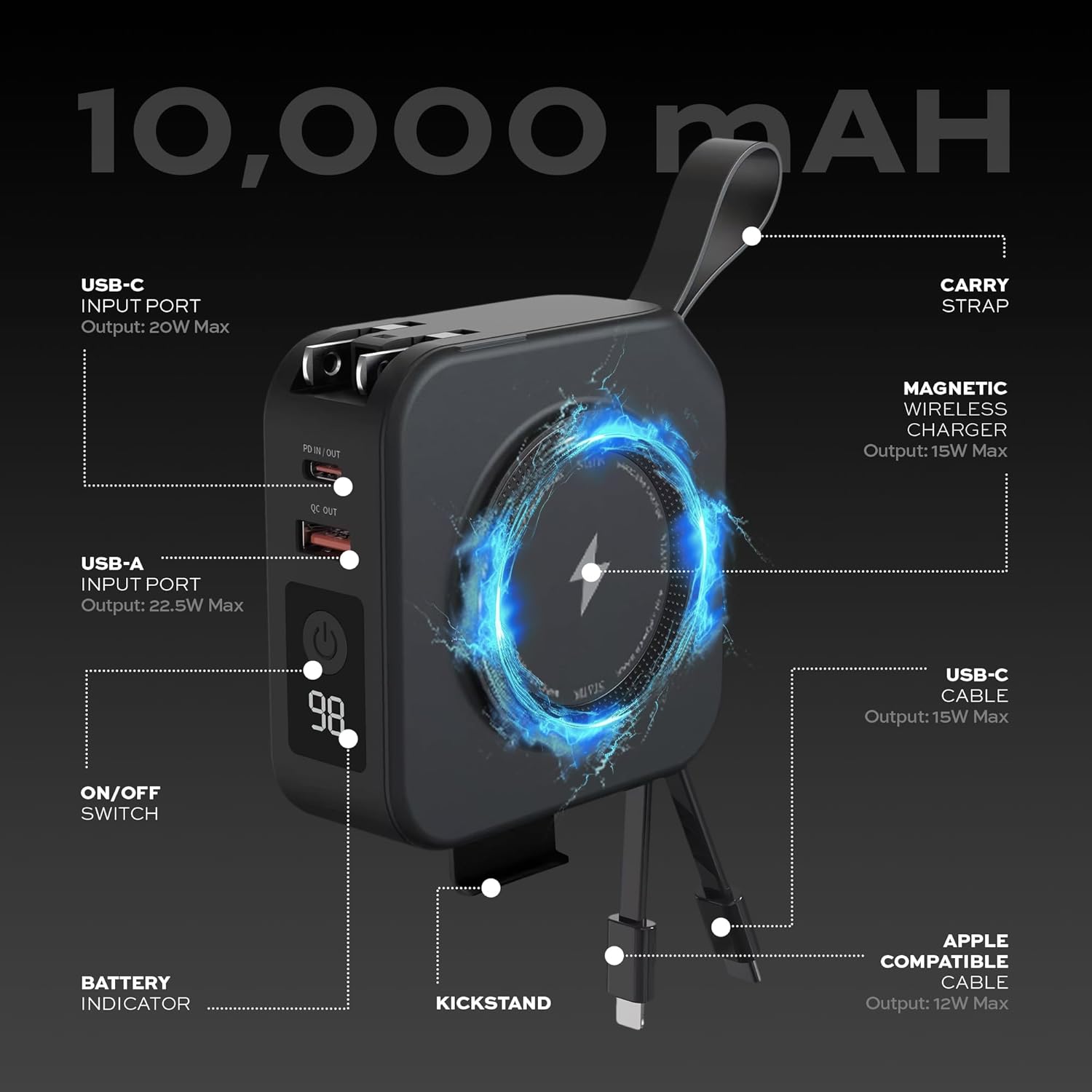 - 10,000 mAh Wall Outlet Travel Power Bank. Holds enough power to recharge a standard SmartPhone 2 times, or Wireless Earphones 12 times. Charging compatible with iPhone 15 and Airpods.
