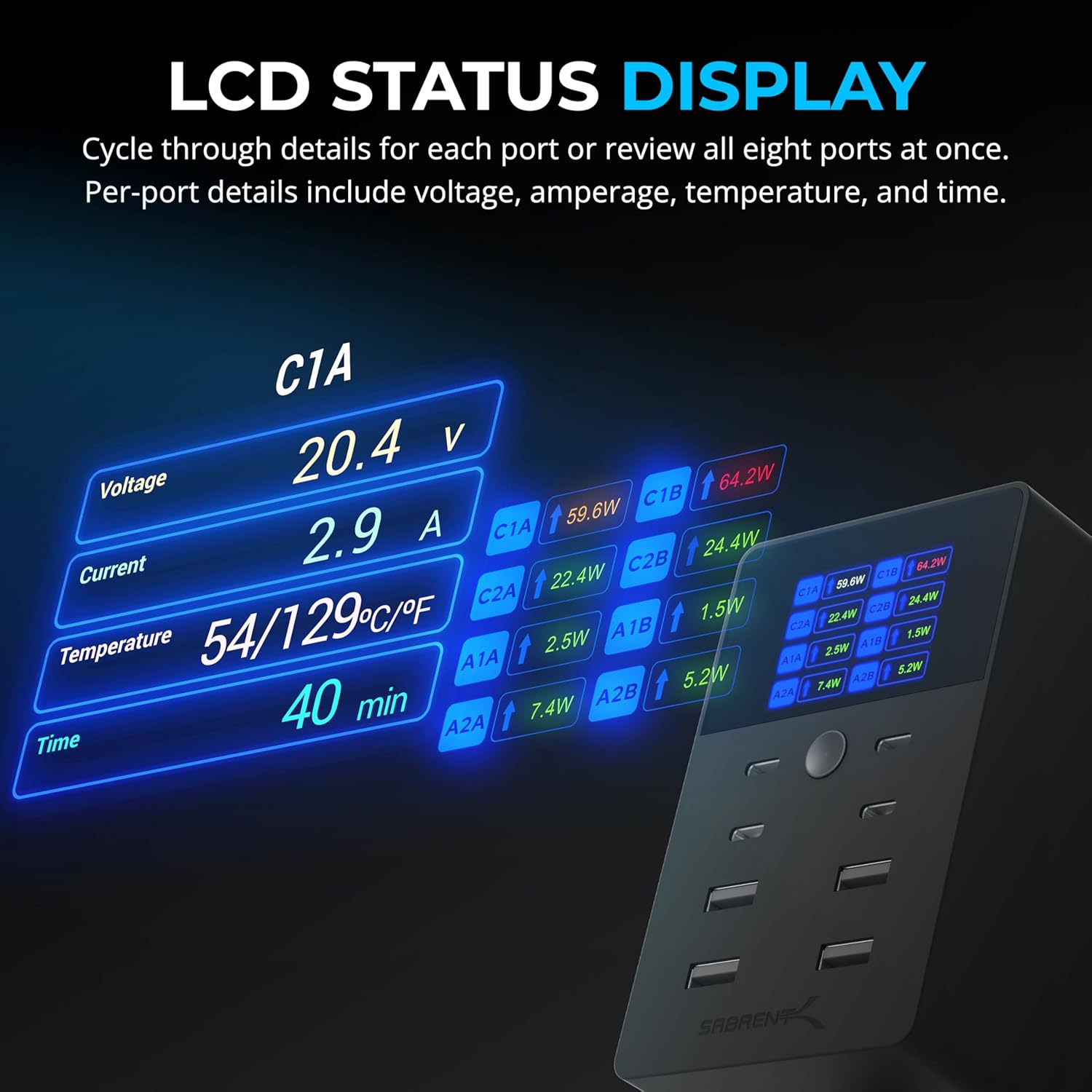 - Powerful All-in-One Charger: Charge all your devices with a compact 8-port charger delivering up to 252W total output. Featuring an informative color LCD, monitor real-time charging details, including voltage, amperage, and port-specific status, for effortless power management.