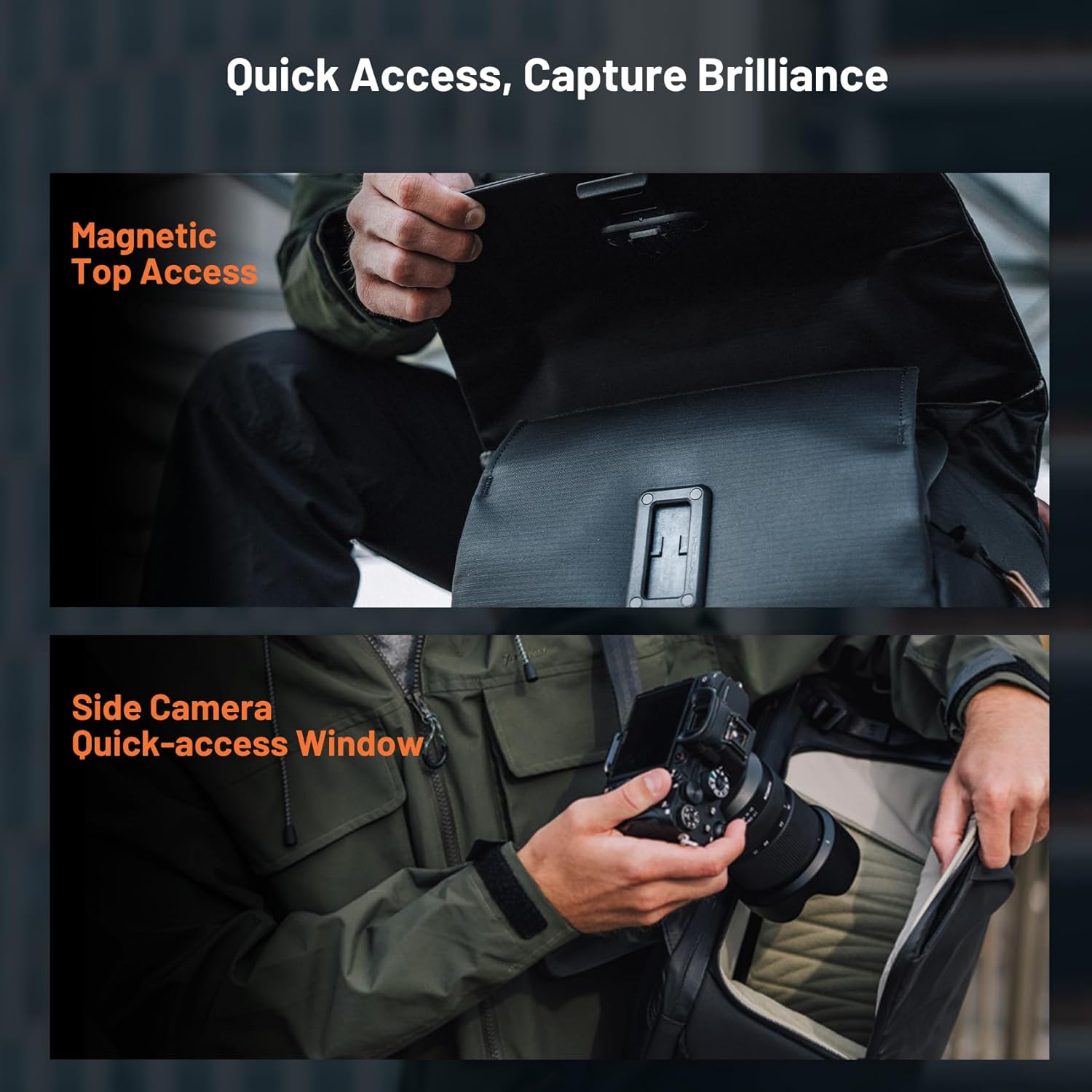 - Dual Quick Access System: 180° main access + magnetic top and side camera pockets. Fixed shoulder strap attachment for camera clips. Optimized quick access in dynamic environments