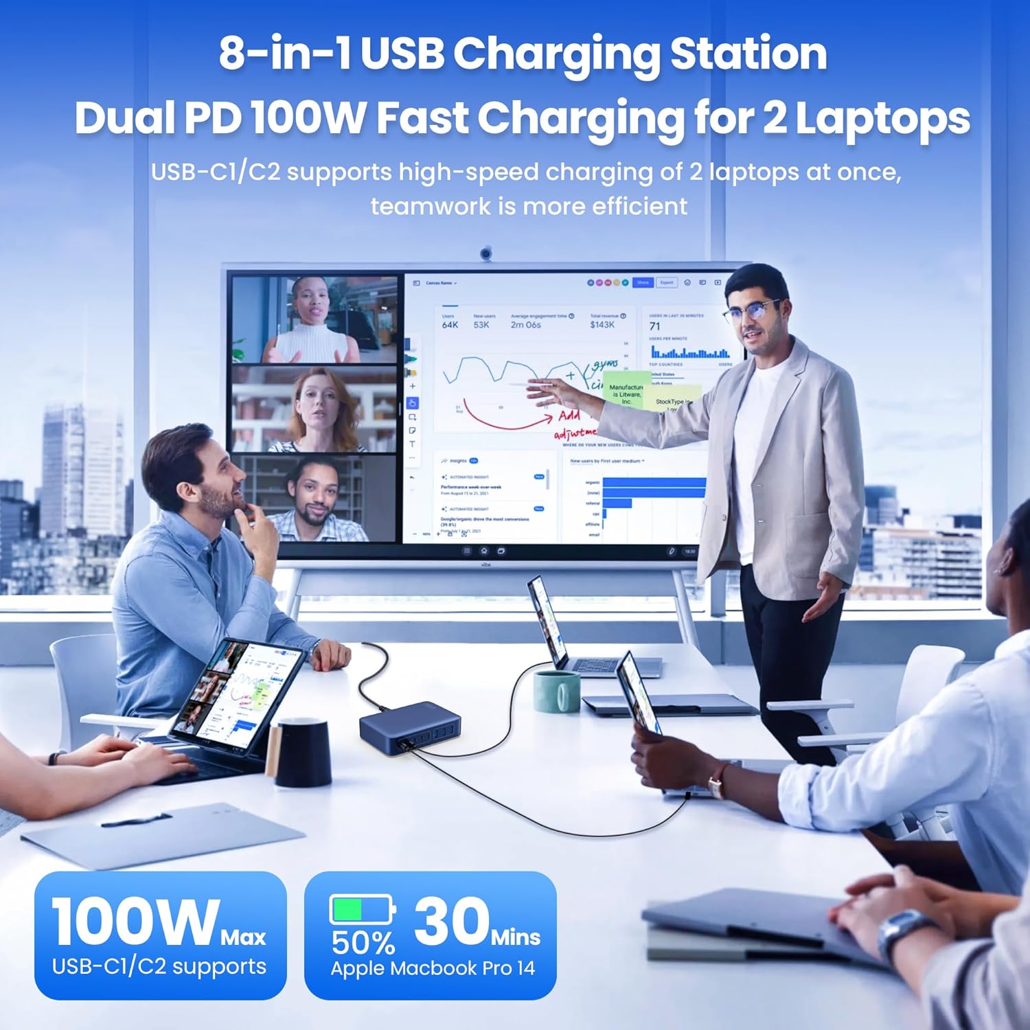 - 【Upgraded Dual PD 100W for MaceBook Charger】The USB-C1&C2 ports support advanced PD 100W fast charger ports,it Charges a MacBook Pro 16'' M1 / M2 from 0% to 55% in about 30 minutes and a full charge in just 1.6 hours, and an iPhone 16 from 0% to 65% in about 30 minutes. we's USB-C charger block can super-fast charge 2 laptop, 1 phones/tablets and 5 others at once,from large to small, the usb-c power adapter compatible with 1000+ devices include MacBook Pro/Air, Microsoft Surface, Dell XPS, Samsung Galaxy, iPad Pro, Steam Deck, iPhone, Google Pixel, covering a whole family needs and save money&space.