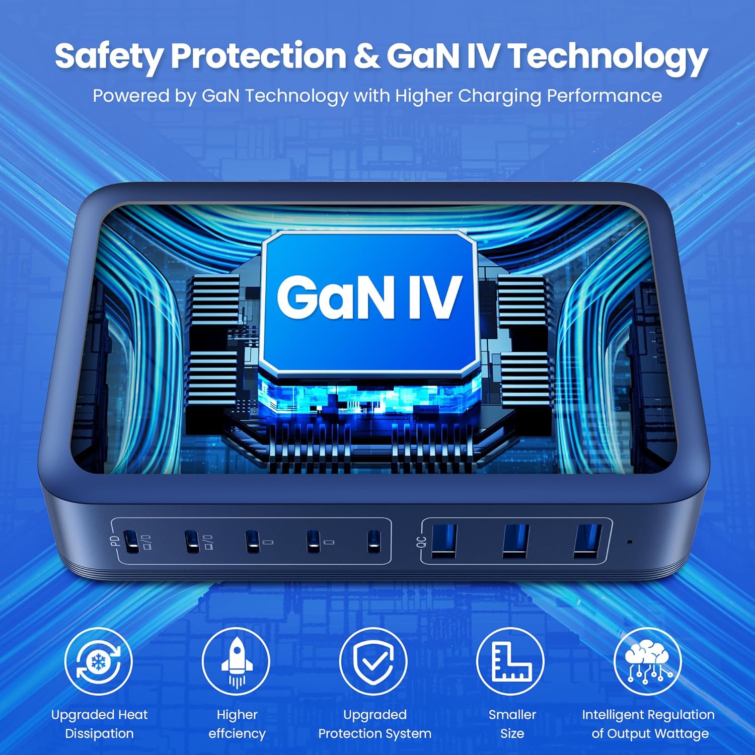 - 【8-in-1 USB C Charging Station】: The USB C Wall Charger features 5 USB C ports and 3 USB A ports for powering phones, tablets, headphones, smartwatches, game consoles and more. No need to wait, you can quickly charge up to 8 devices at the same time, and each port intelligently distributes power to ensure you get optimal charging efficiency!no need for more adapters,this 8-in-1 charging station will reduce your accessories burden and help you create an organized and clean desktop.Our GaN IV desktop charging station easy to carry,just L 4.7*W 3.3*H 1.1 inch and weighs 0.6kg,With the free 5FT/1.5m long Detachable power charging cord,Applicable to desktop, bedside, counter, nightstand, office.