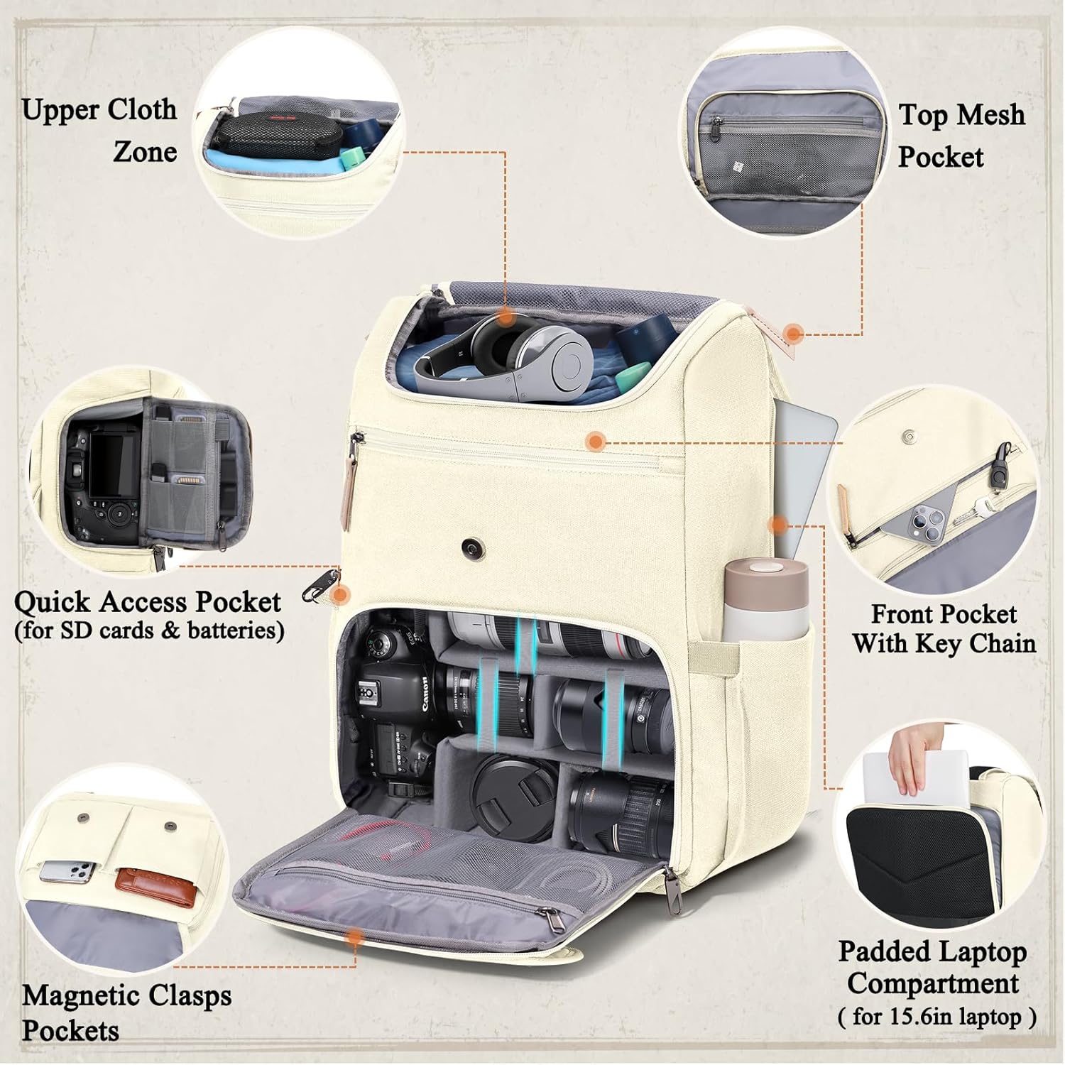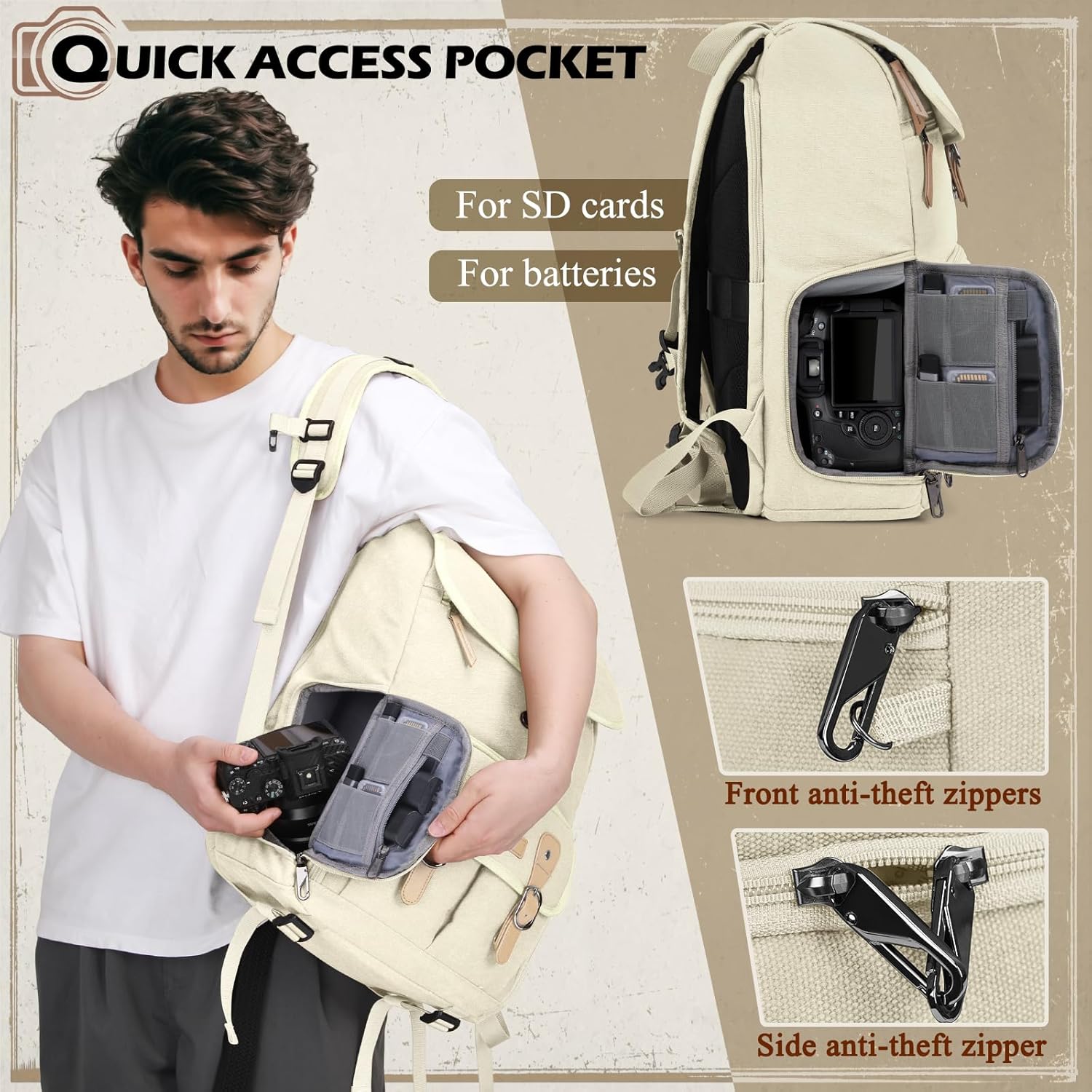 - SUPERIOR CAMERA PROTECTION: Made from water-resistant and scratch-resistant canvas, equipped with a waterproof rain cover, this waterproof camera backpack provides dual protection for your precious photography accessories from any unexpected weather. Soft velvet lining and 360°padded cushioning of the photography backpack ensure shock absorption and safeguard cameras, lenses, flash from impacts, scratches, and other potential damages.